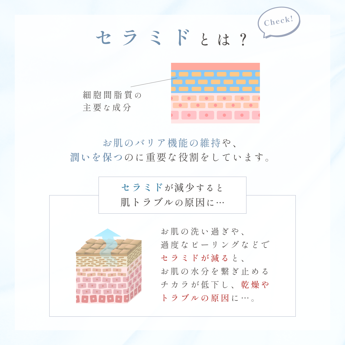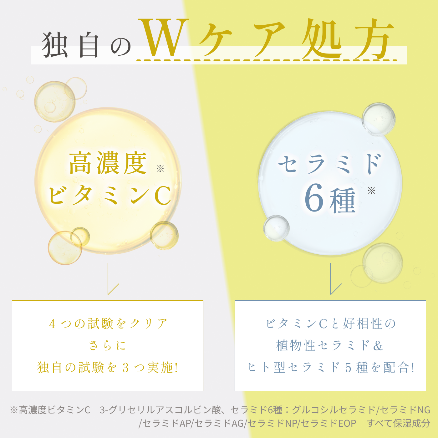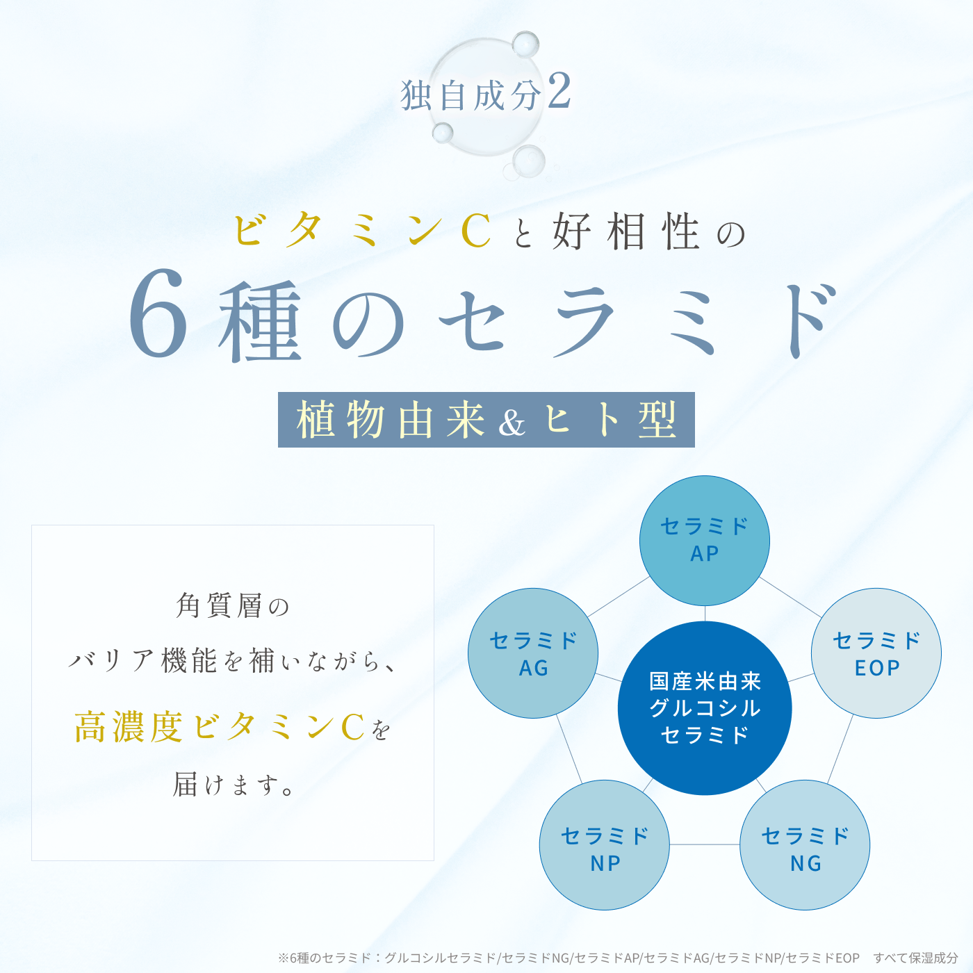 水、DPG 、グリセリン、3-グリセリルアスコルビン酸、グリセレス-26、イヌリン、メチルグルセス-20、PPG-6 デシルテトラデセス-30、クエン酸Na、クエン酸、ペンチレングリコール、BG、フェノキシエタノール、オレンジ油、EDTA-2Na、キサンタンガム、(スチレン/VP)コポリマー、ピロ亜硫酸Na、カラメル、オウレン根エキス、テリハポク種子油*1、α-グルカン、水添レシチン、フィトステロールズ、グルコシルセラミド、セラミドNG、セラミドAP、セラミドAG、セラミドNP、セラミドEOP、トコフェロール、ソルビン酸