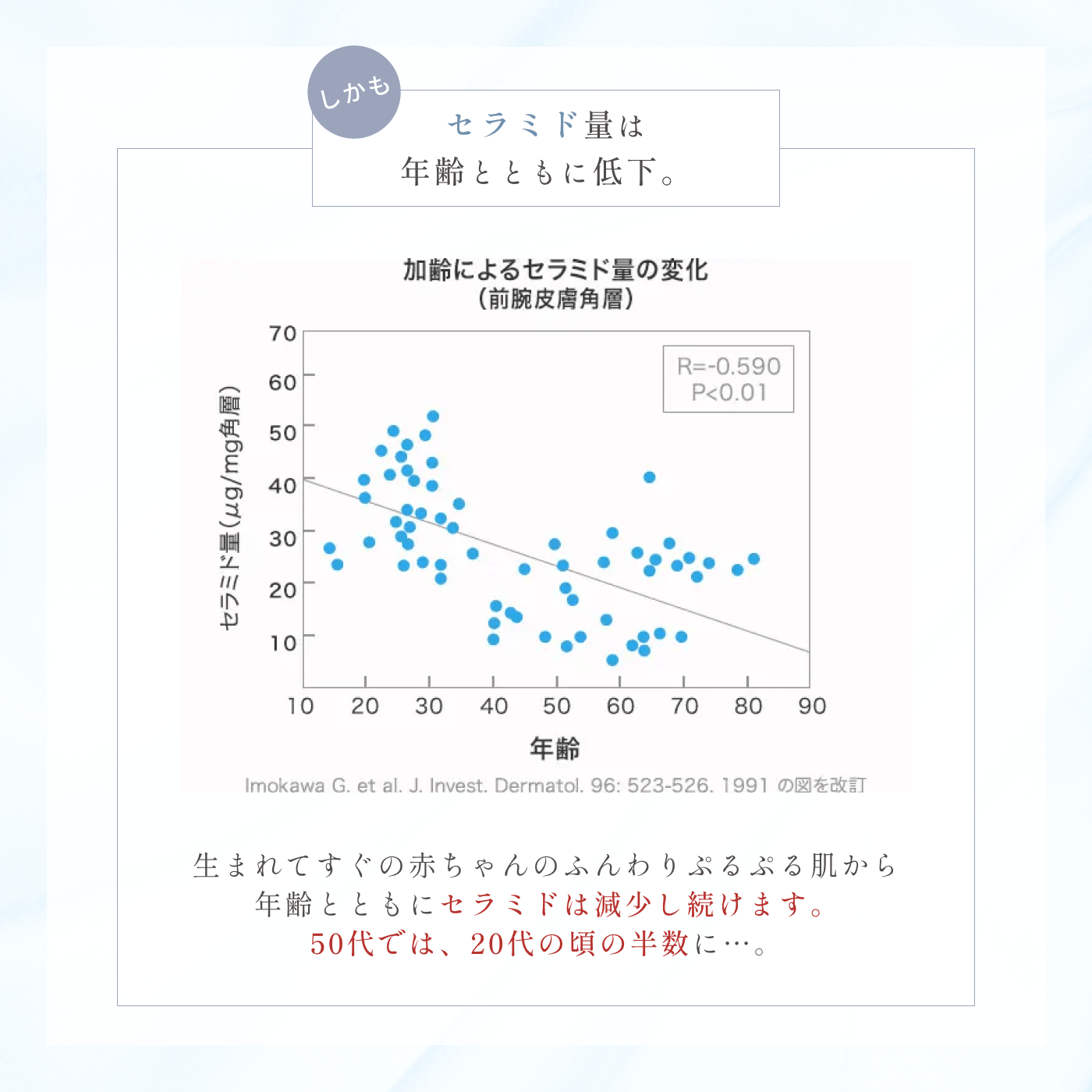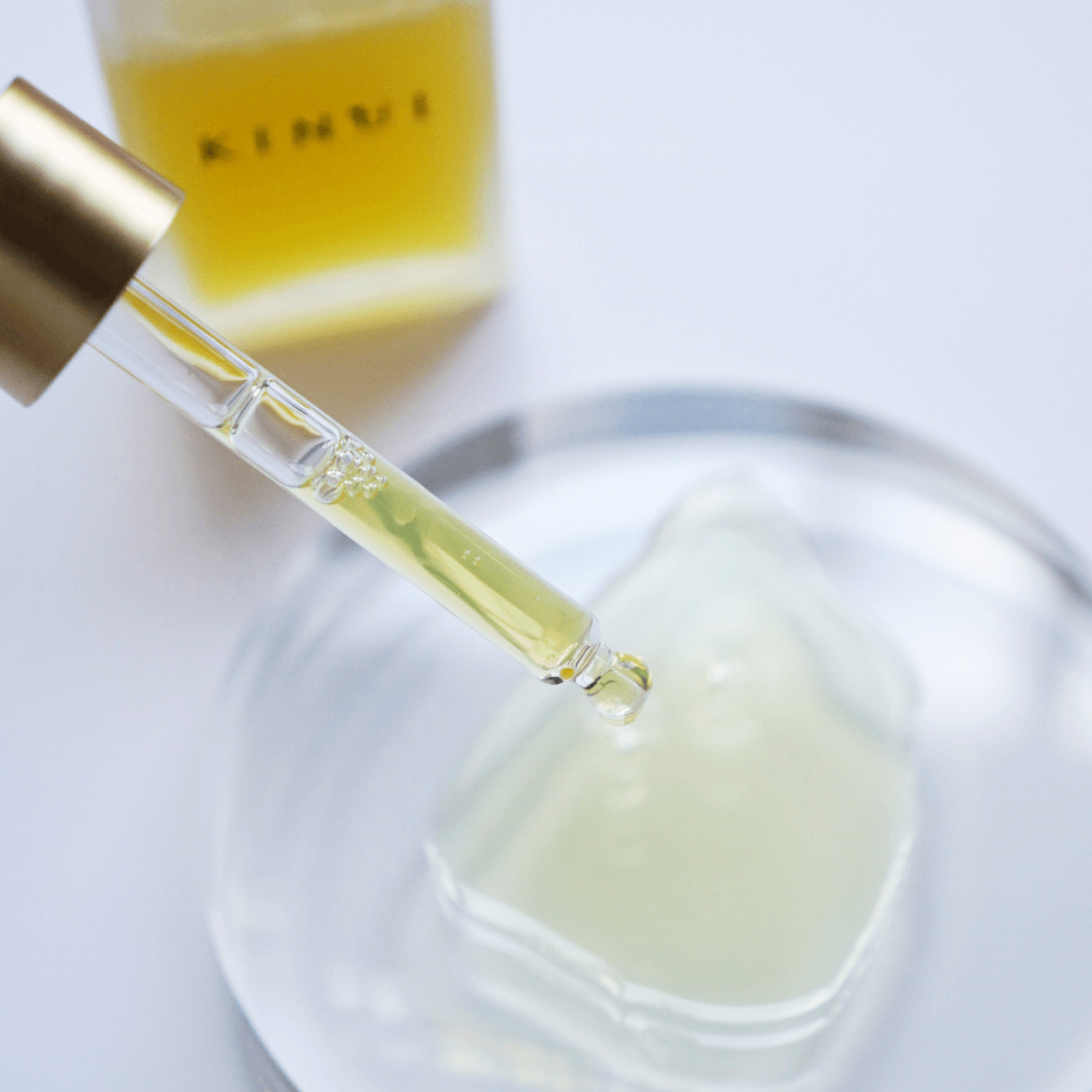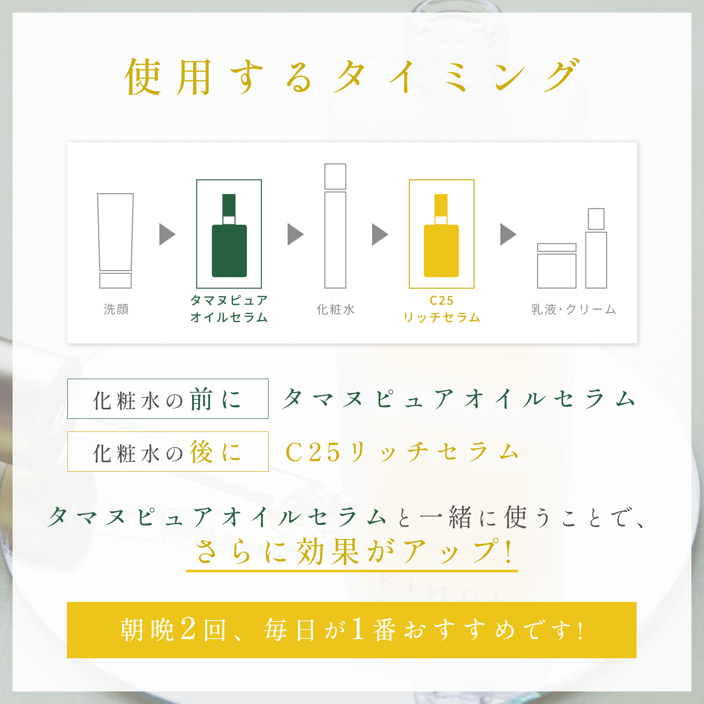 顔の中心から輪郭に向かって、肌を持ち上げるように広げ、ハンドプレスするようにお顔全体になじませてお使いください。
