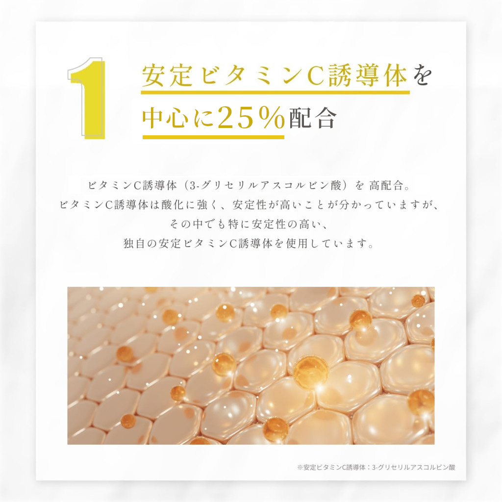 水、DPG 、グリセリン、3-グリセリルアスコルビン酸、グリセレス-26、イヌリン、メチルグルセス-20、PPG-6 デシルテトラデセス-30、クエン酸Na、クエン酸、ペンチレングリコール、BG、フェノキシエタノール、オレンジ油、EDTA-2Na、キサンタンガム、(スチレン/VP)コポリマー、ピロ亜硫酸Na、カラメル、オウレン根エキス、テリハポク種子油*1、α-グルカン、水添レシチン、フィトステロールズ、グルコシルセラミド、セラミドNG、セラミドAP、セラミドAG、セラミドNP、セラミドEOP、トコフェロール、ソルビン酸
