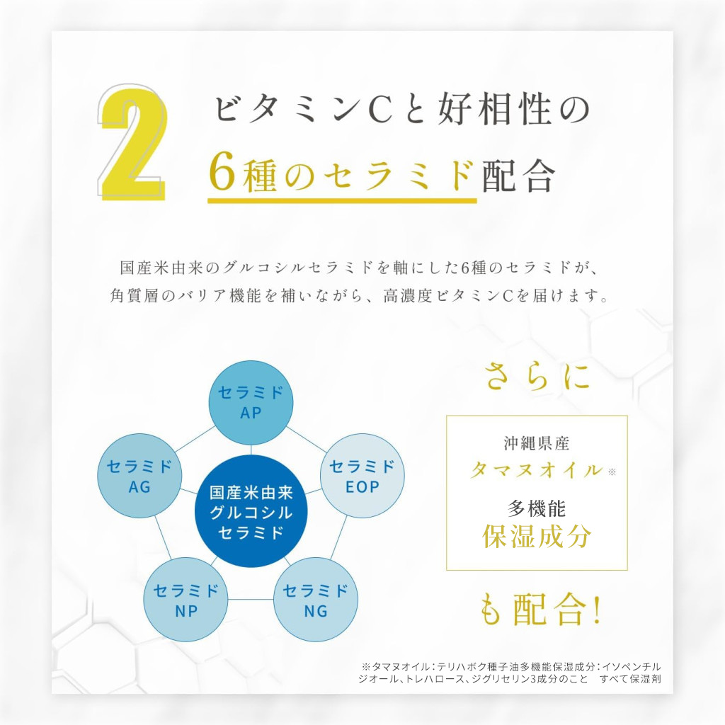 ※1沖縄県産タマヌオイル(保湿成分)ウ果汁発酵液、PCA-Na、グリセリン、酵母エキス、クエン酸、クエン酸Na、テトラヘキシルデカン酸アスコルビル、トコフェロール